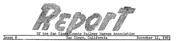 At the November meeting RHSofSD President Earle Swaine stated that the Society would establish a railway museum. Mrs. Gladys Skeen, museum committee chairman, again reported that her group was studying the land problem. She indicated that work was in progress but that she was not in a position to report on the nature of current negotiations. Mrs. Skeen also inquired about the dimensions of a building for one-car storage.