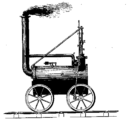 1825: Stephenson's 8-ton LOCOMOTION No. 1 built for the Stockton & Darlington Railroad. Capable of pulling 90 tons of coal at 15 mph. Stephenson plans all details of the line, and even designs the bridges, machinery, engines, turntables, switches, and crossings, and is responsible for every part of the work of their construction. (The passenger coaches of this time were all drawn by horses.)